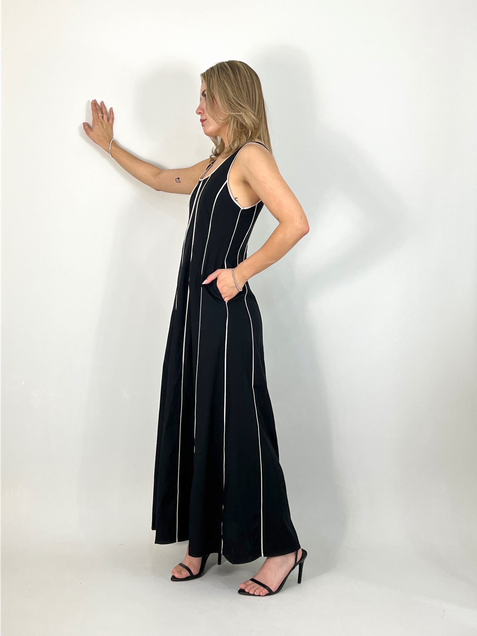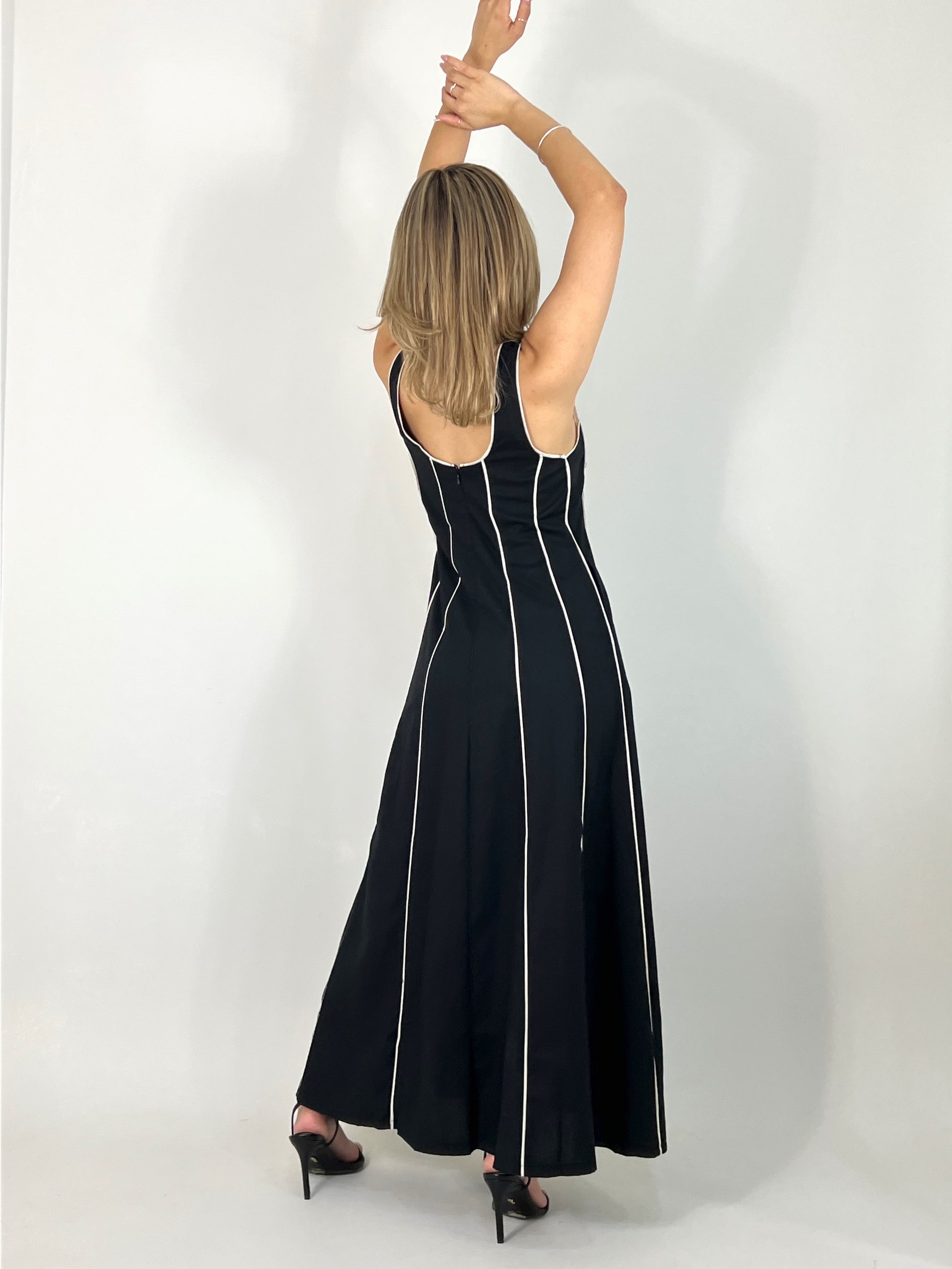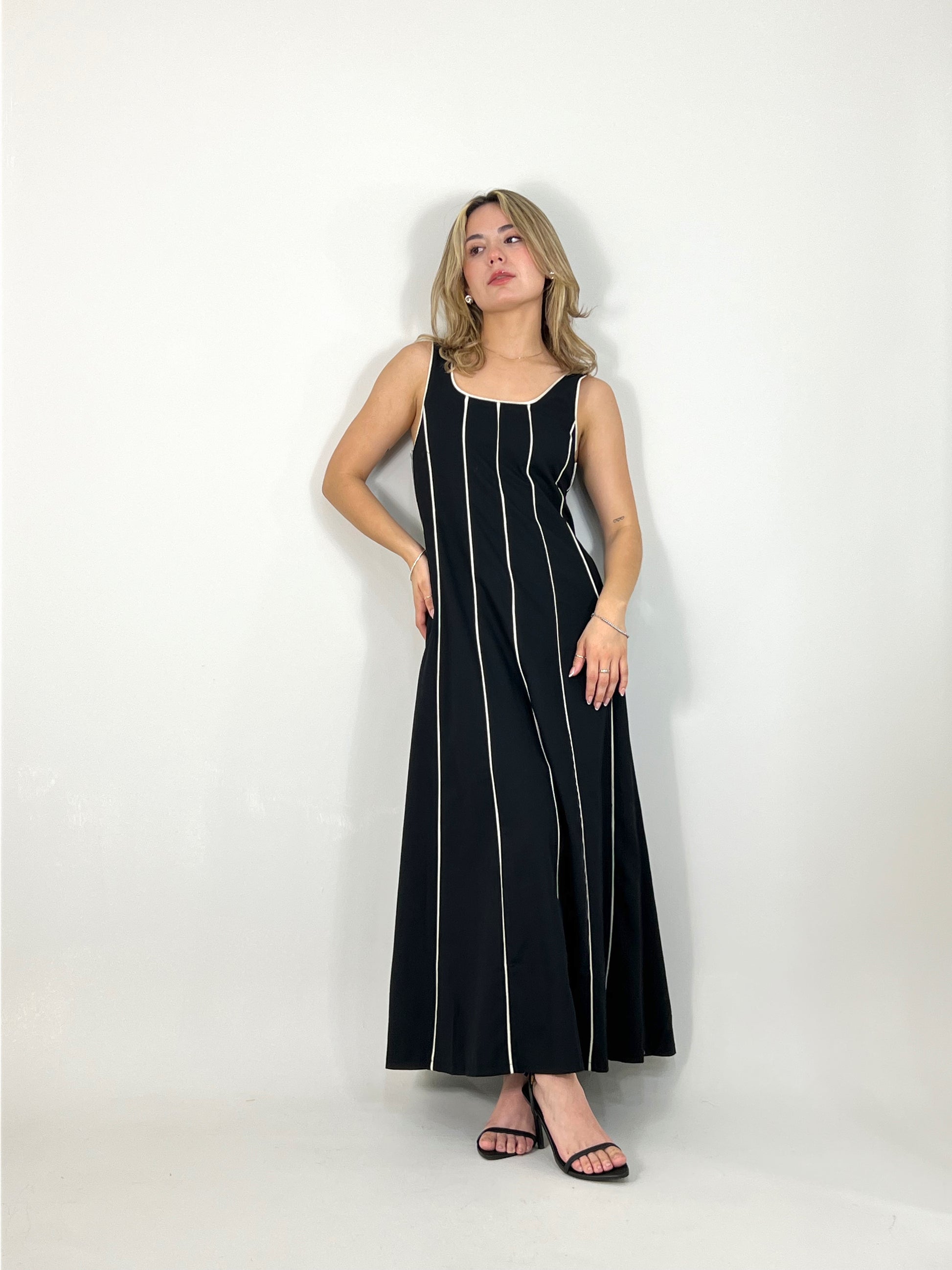 Vestido largo con en A. Material poroso, tipo lino, pesado con vuelo. Detalle de costuras claras, tirantes anchos. Escote en espalda pronunciado.