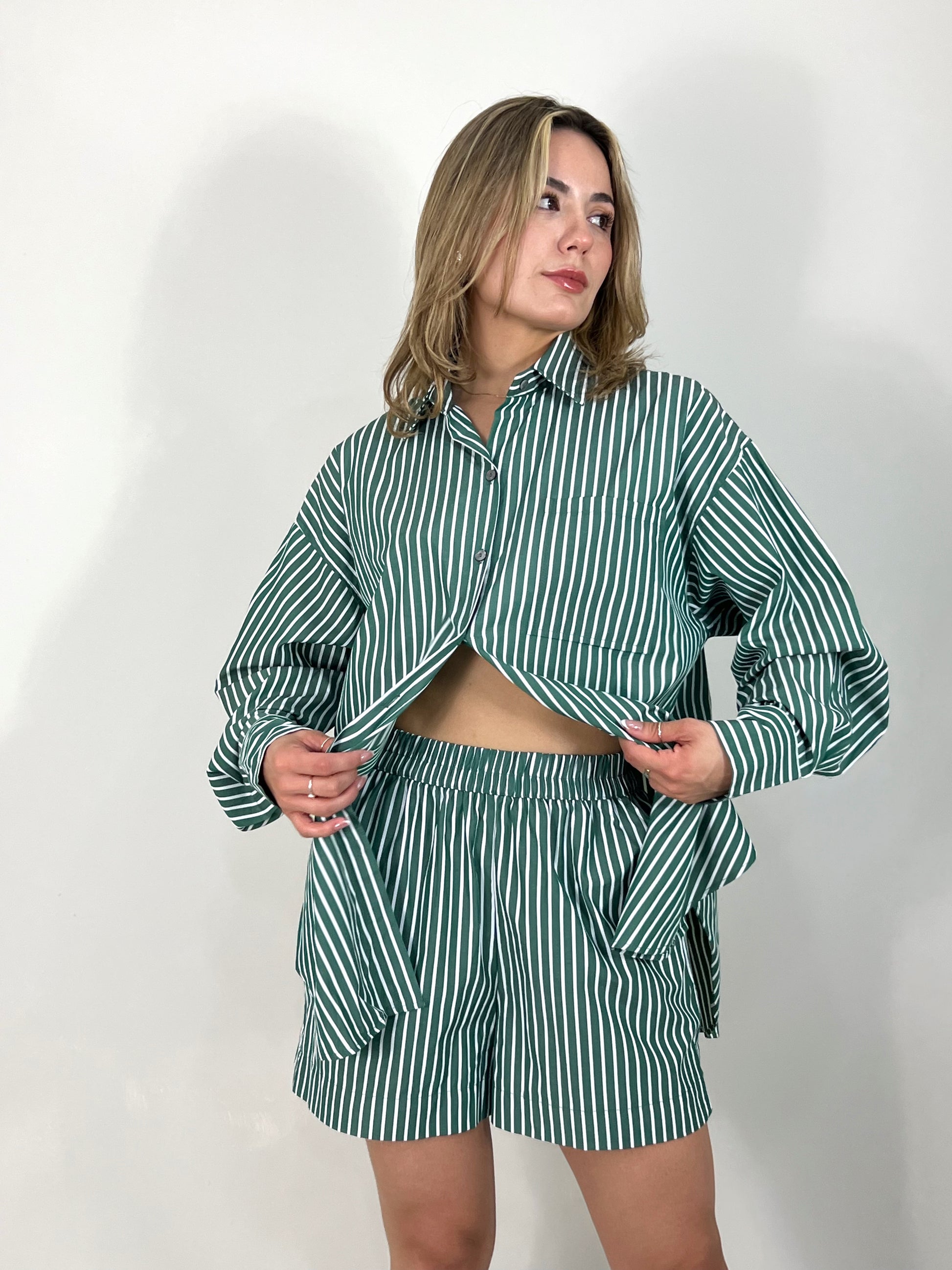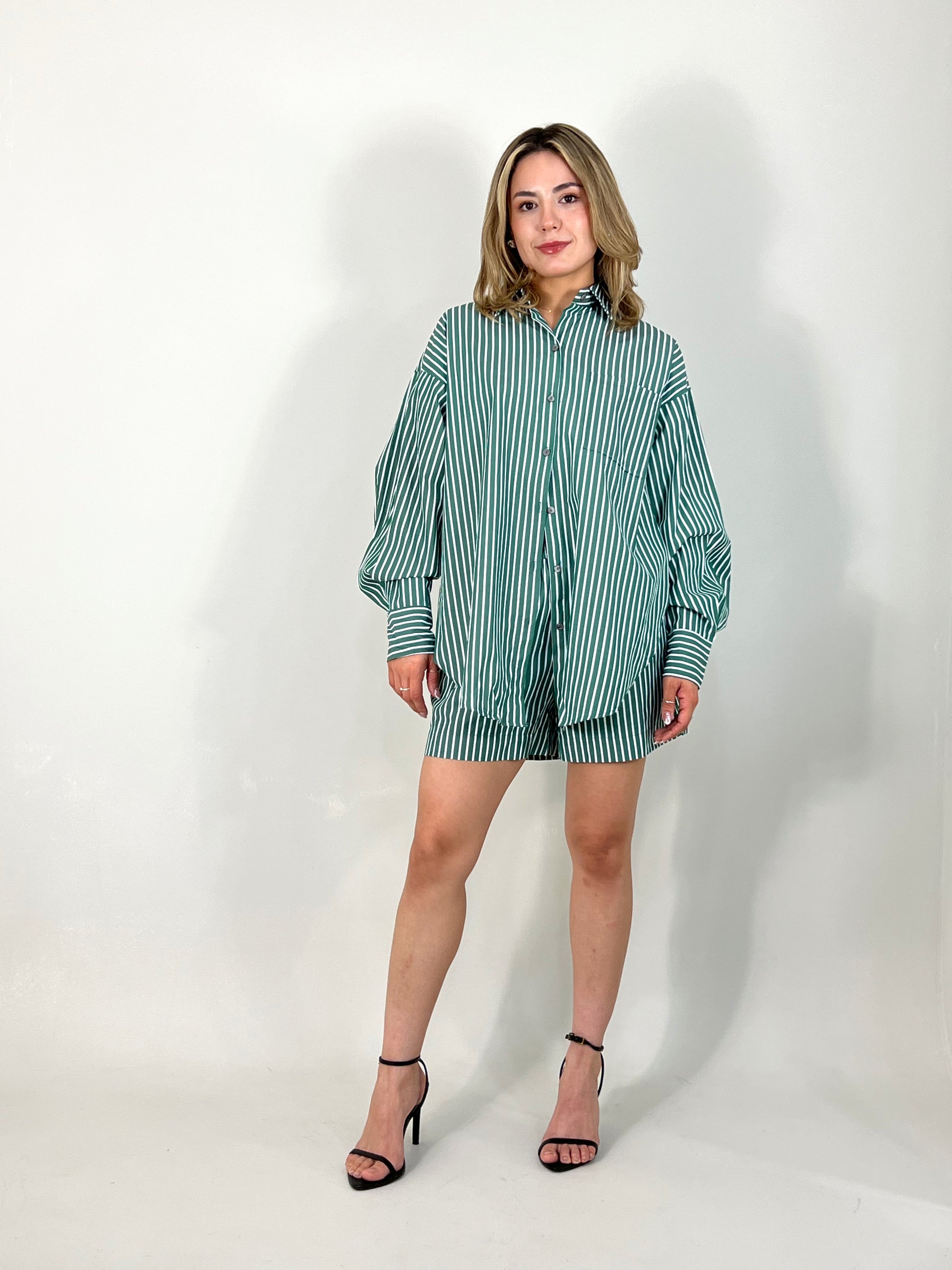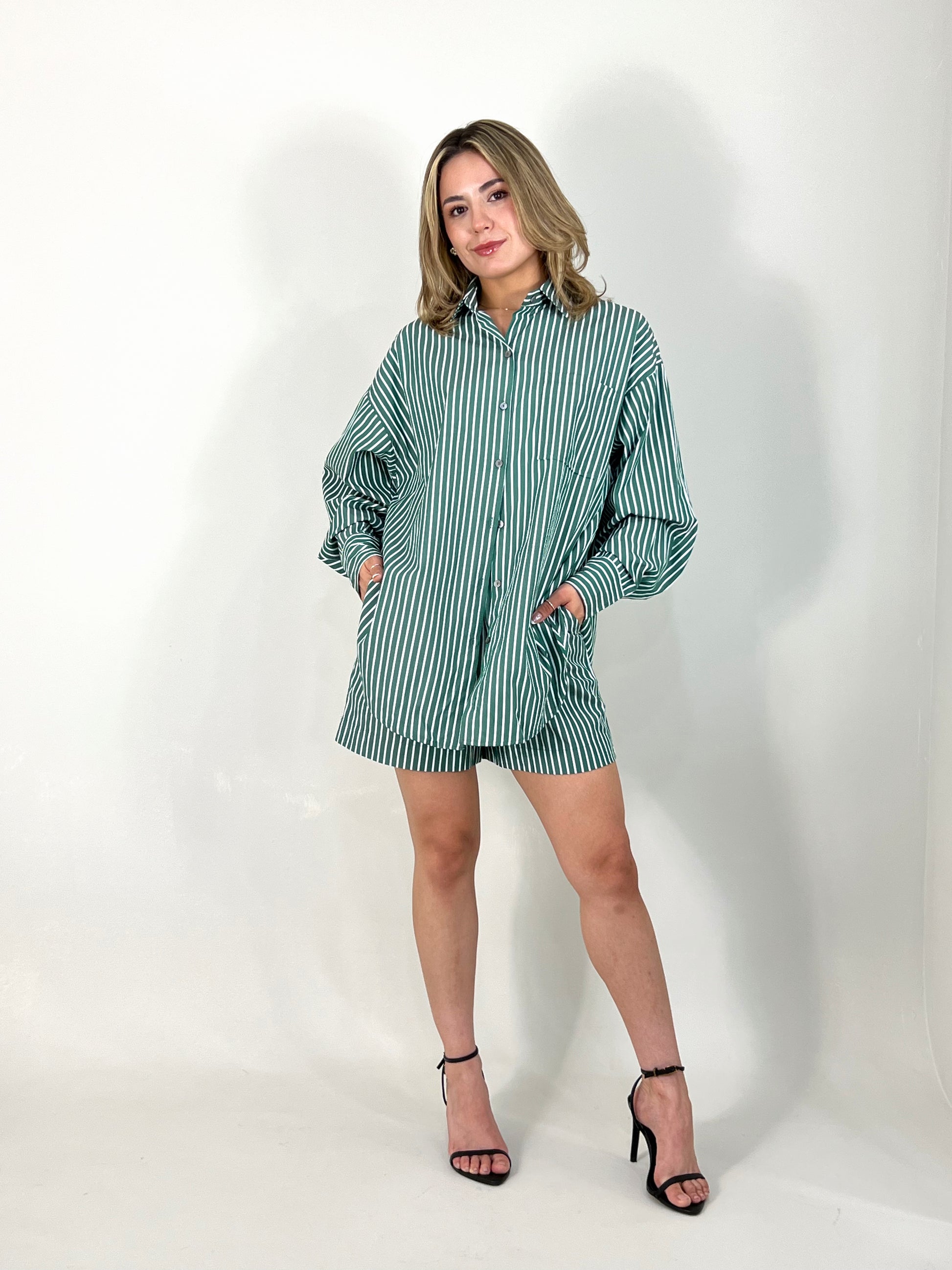 Set de doa piezas. Camisa oversized. Short con elástico ancho en cintura y. bolsillos.