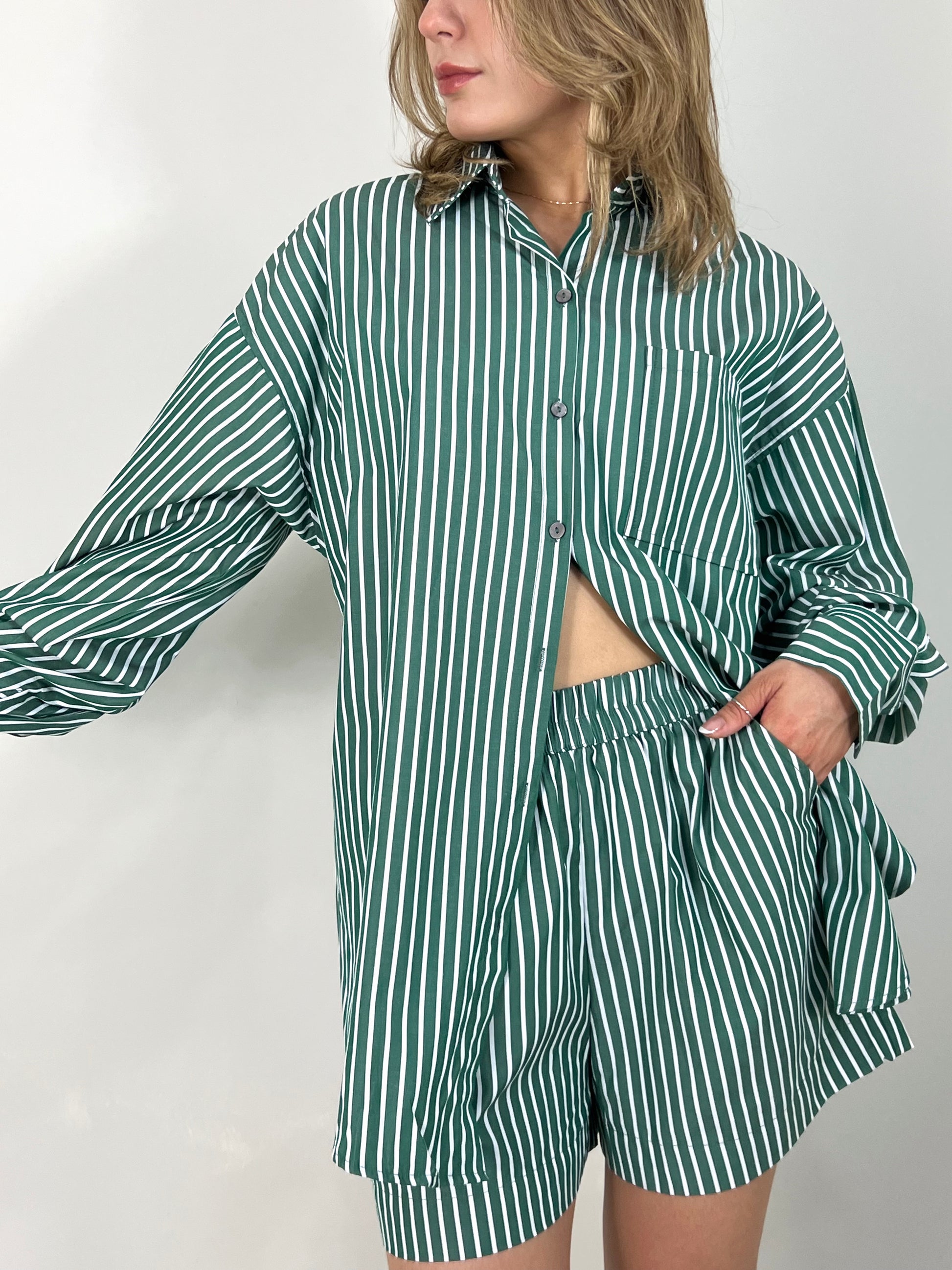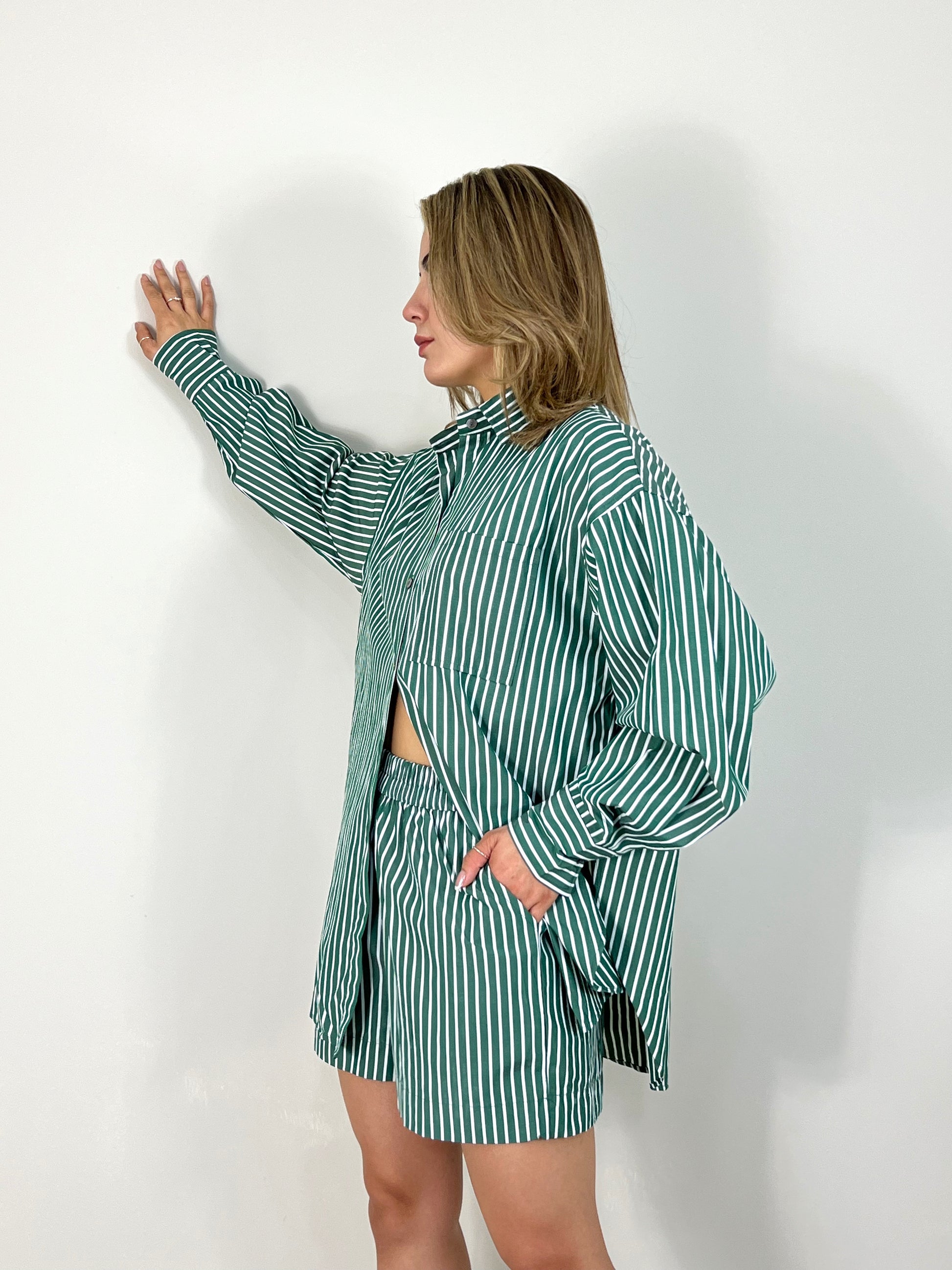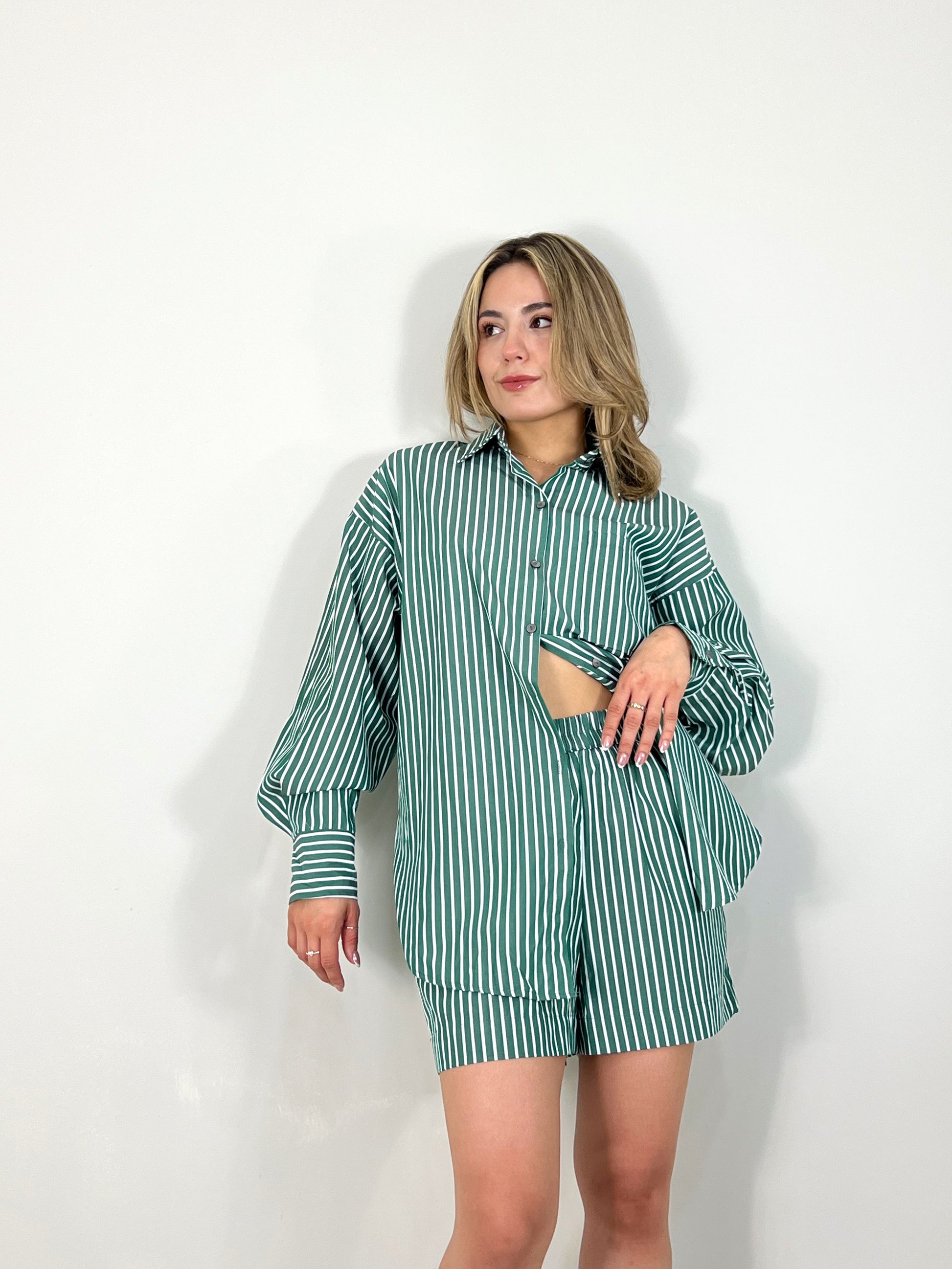 Set de doa piezas. Camisa oversized. Short con elástico ancho en cintura y. bolsillos.