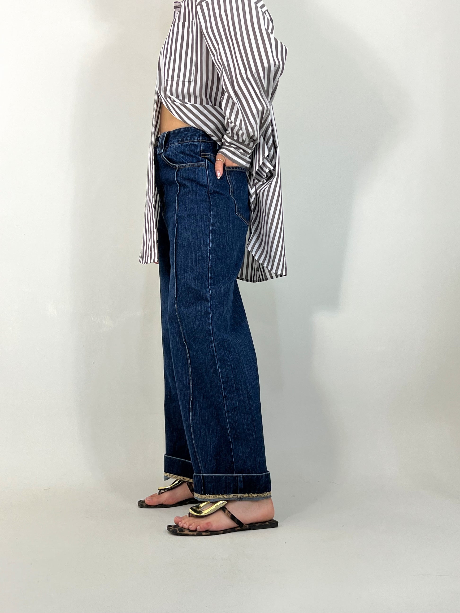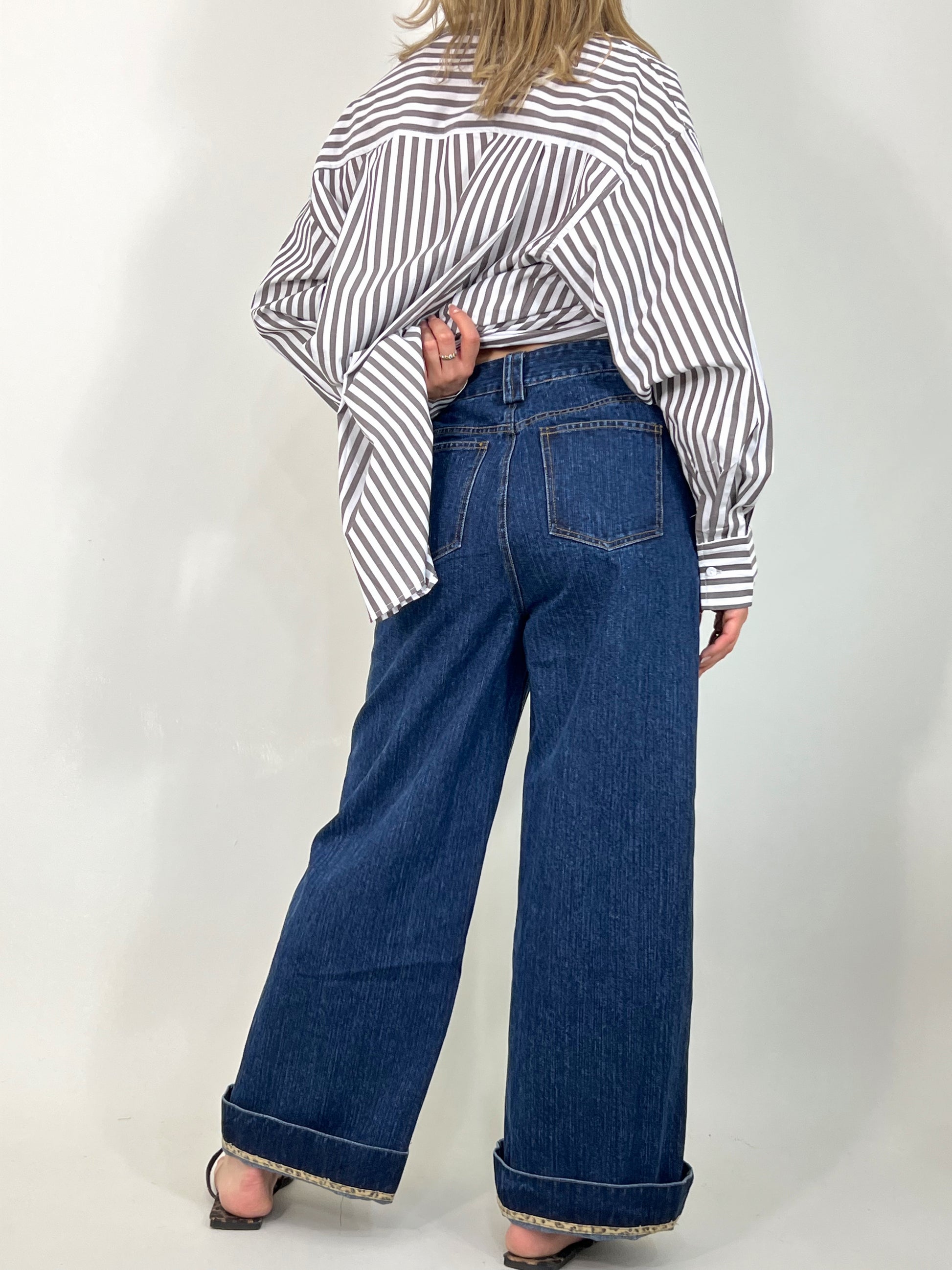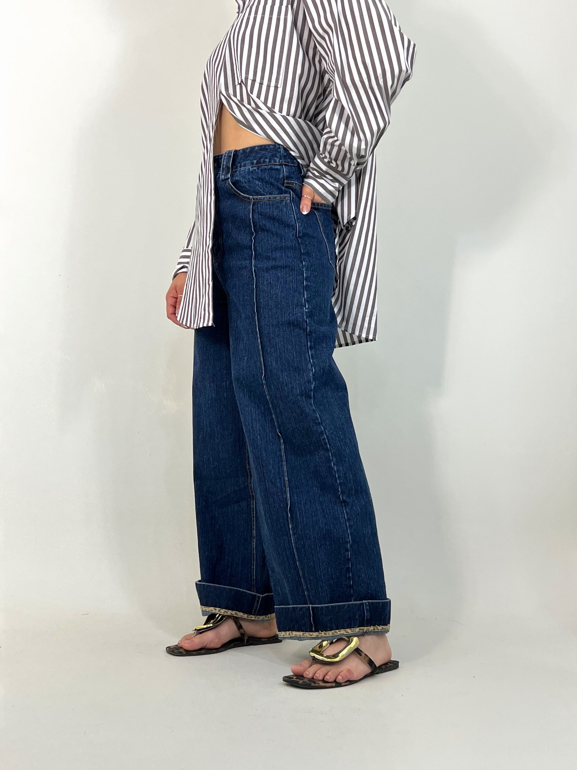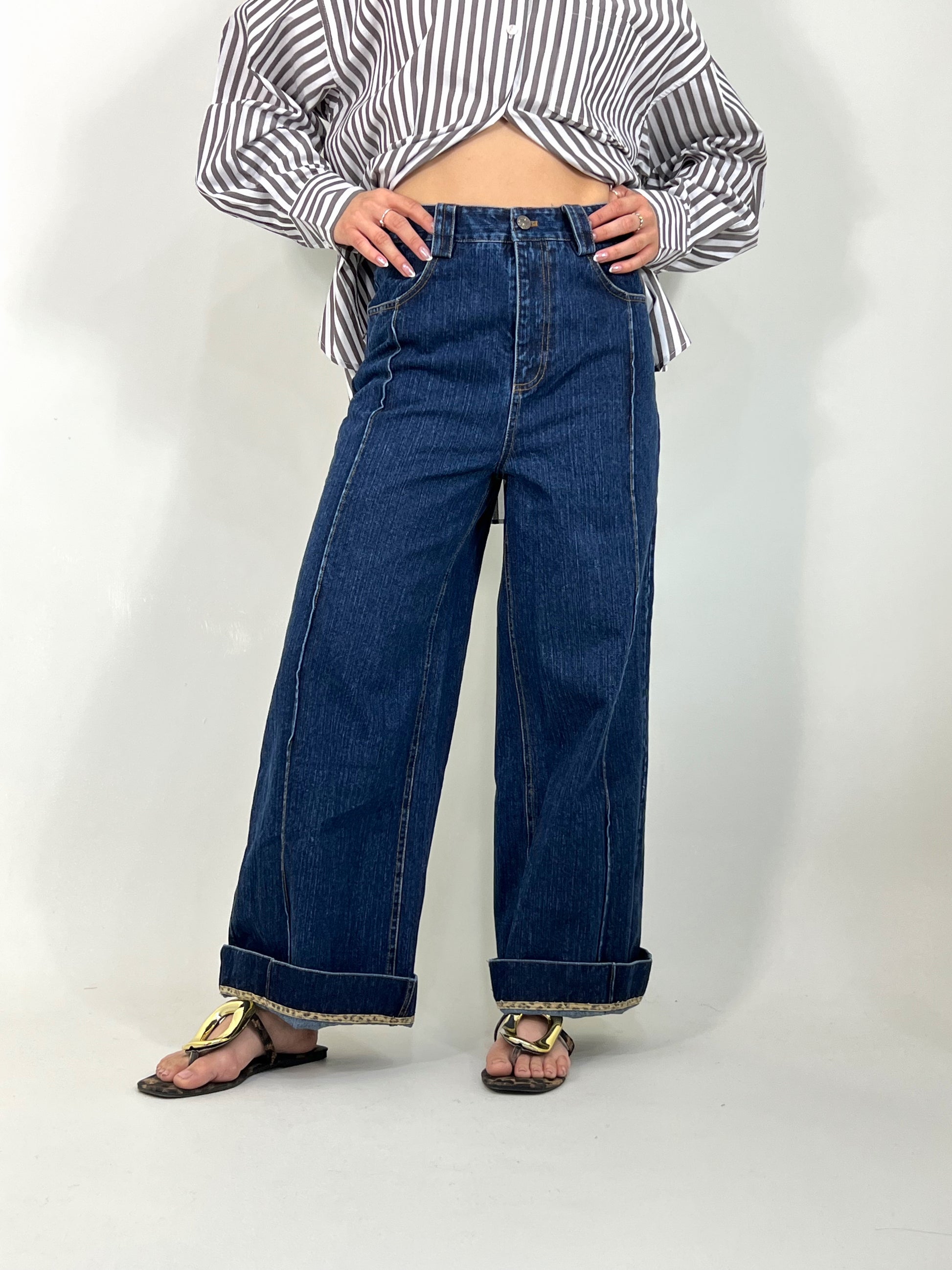 Pantalón de mezclilla corte wide leg. Detalle de costuras al frente y línea animal print al doblarlo.