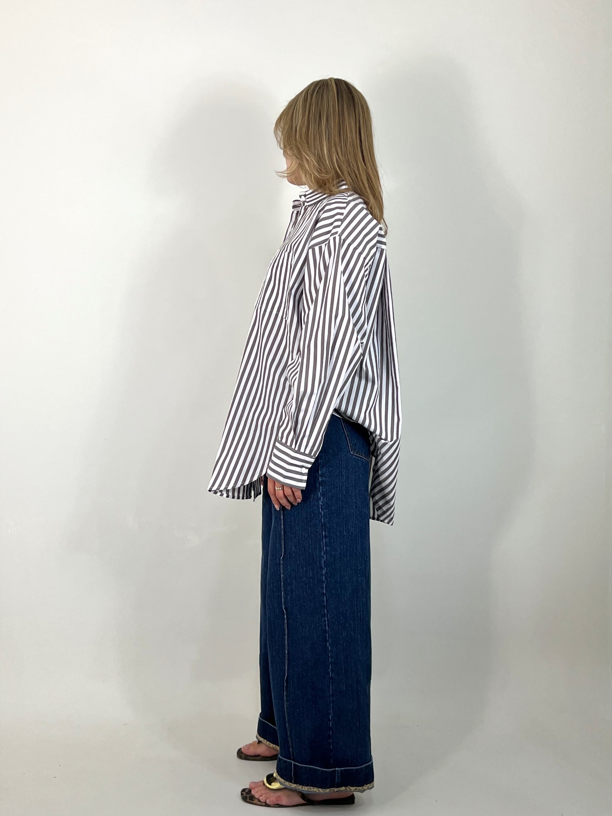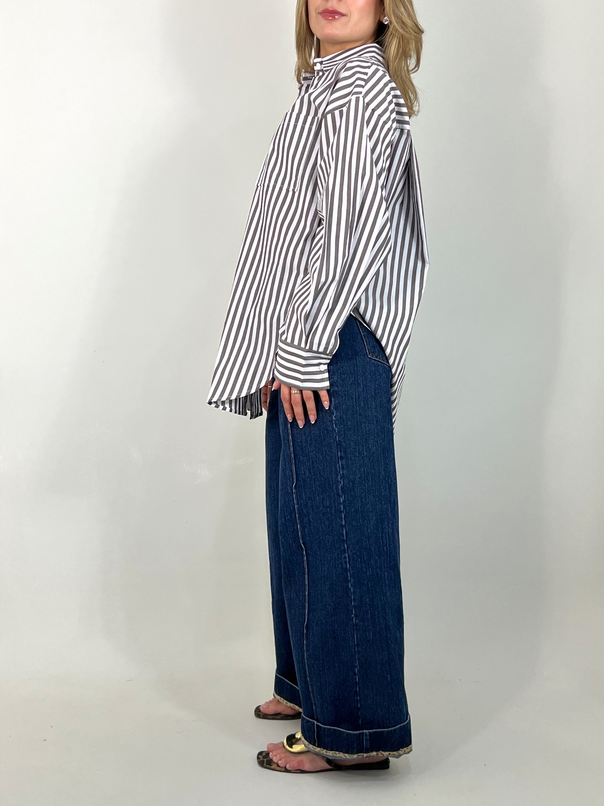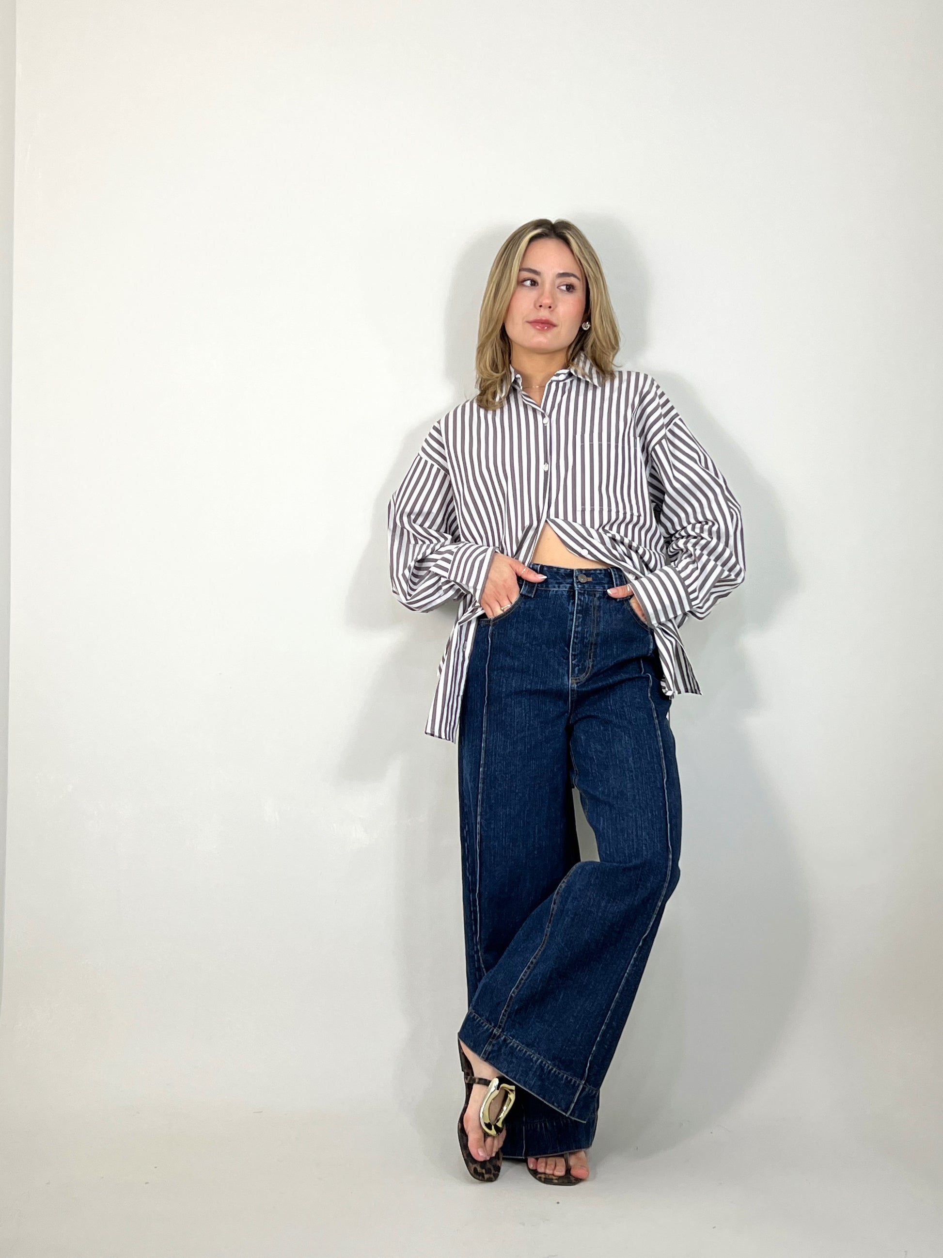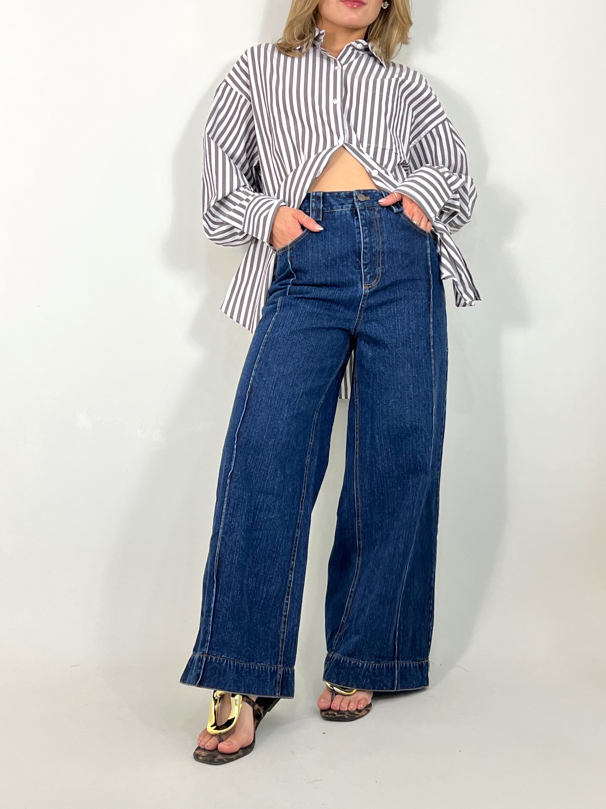 Pantalón de mezclilla corte wide leg. Detalle de costuras al frente y línea animal print al doblarlo.