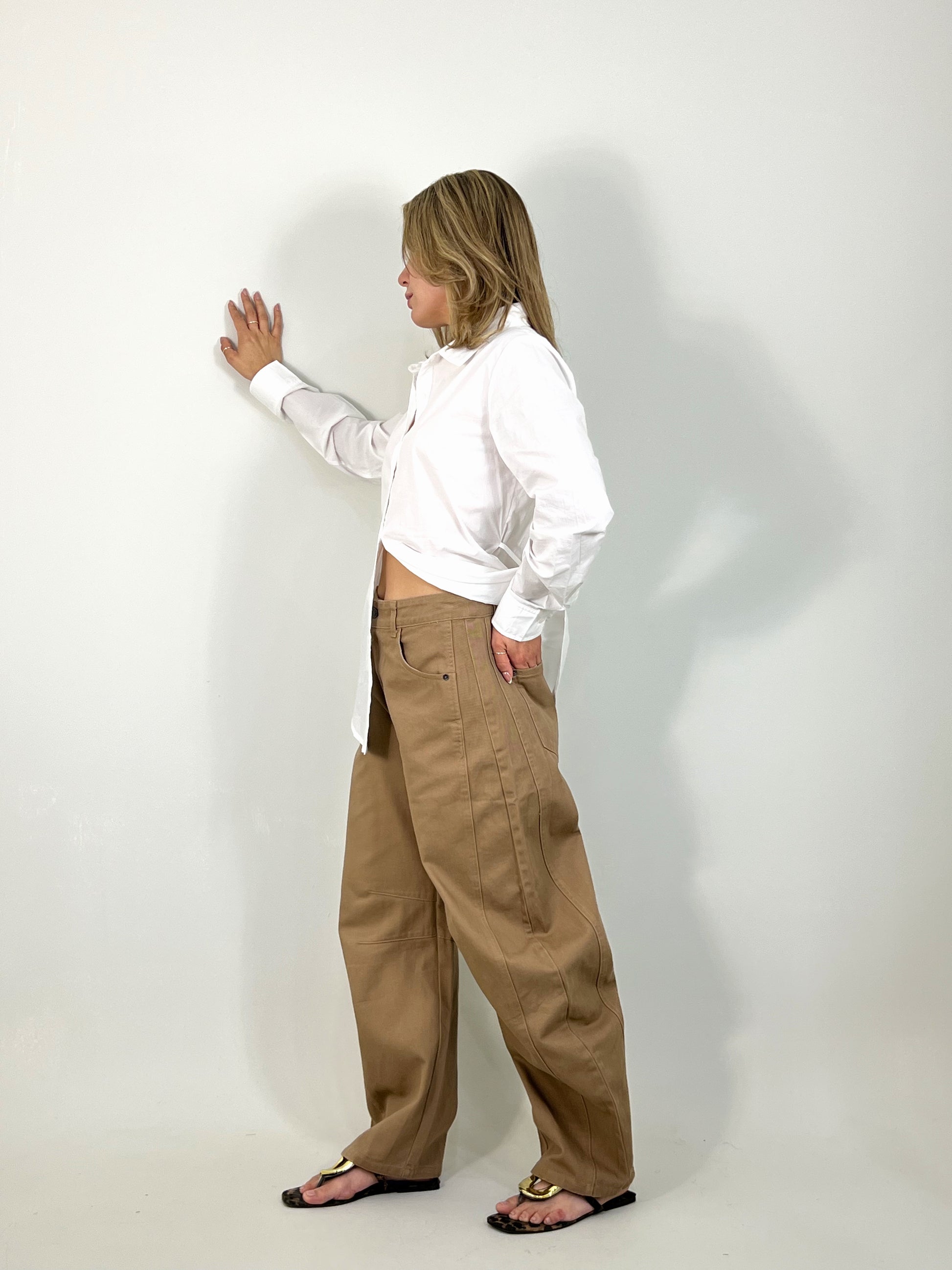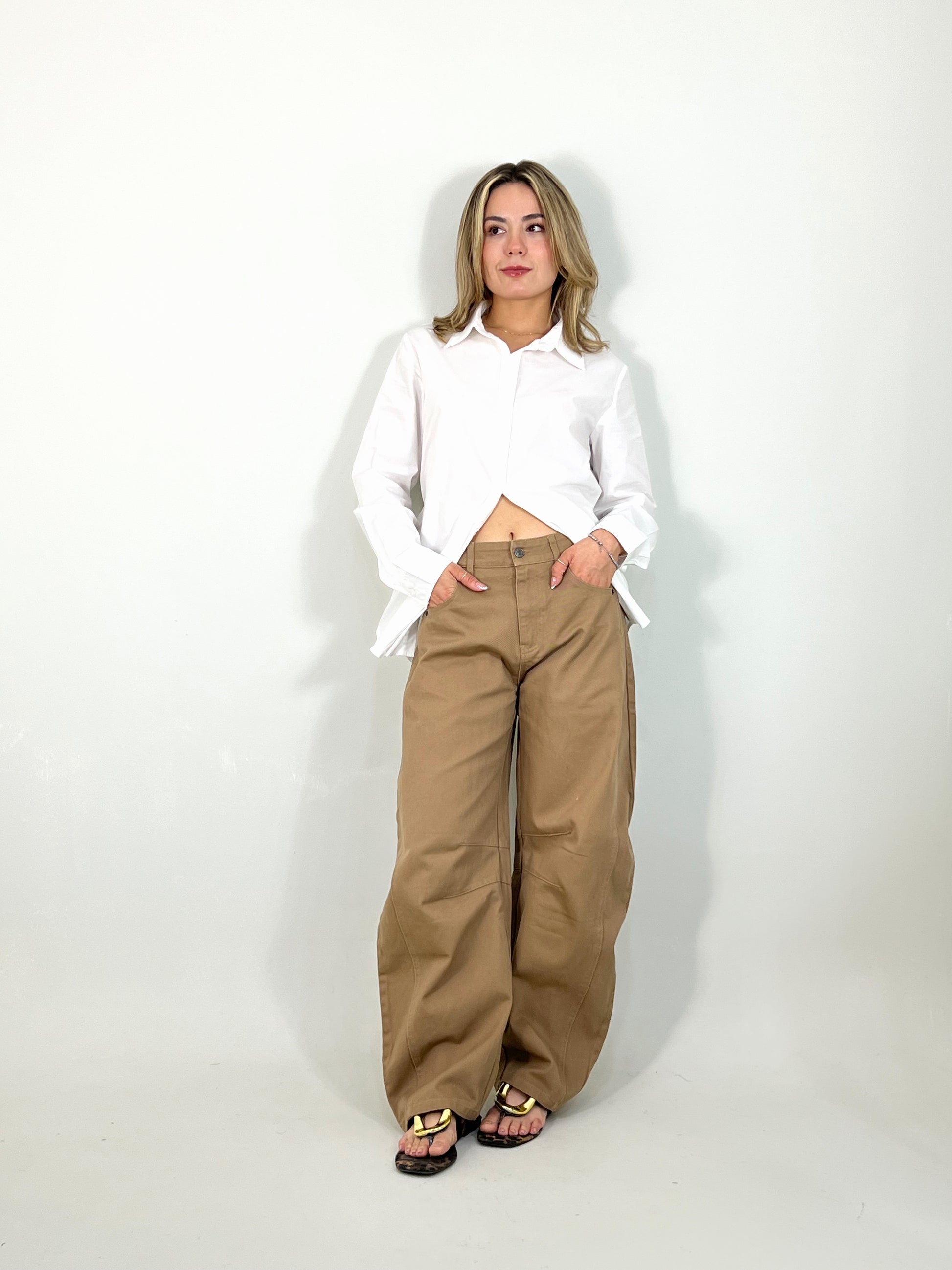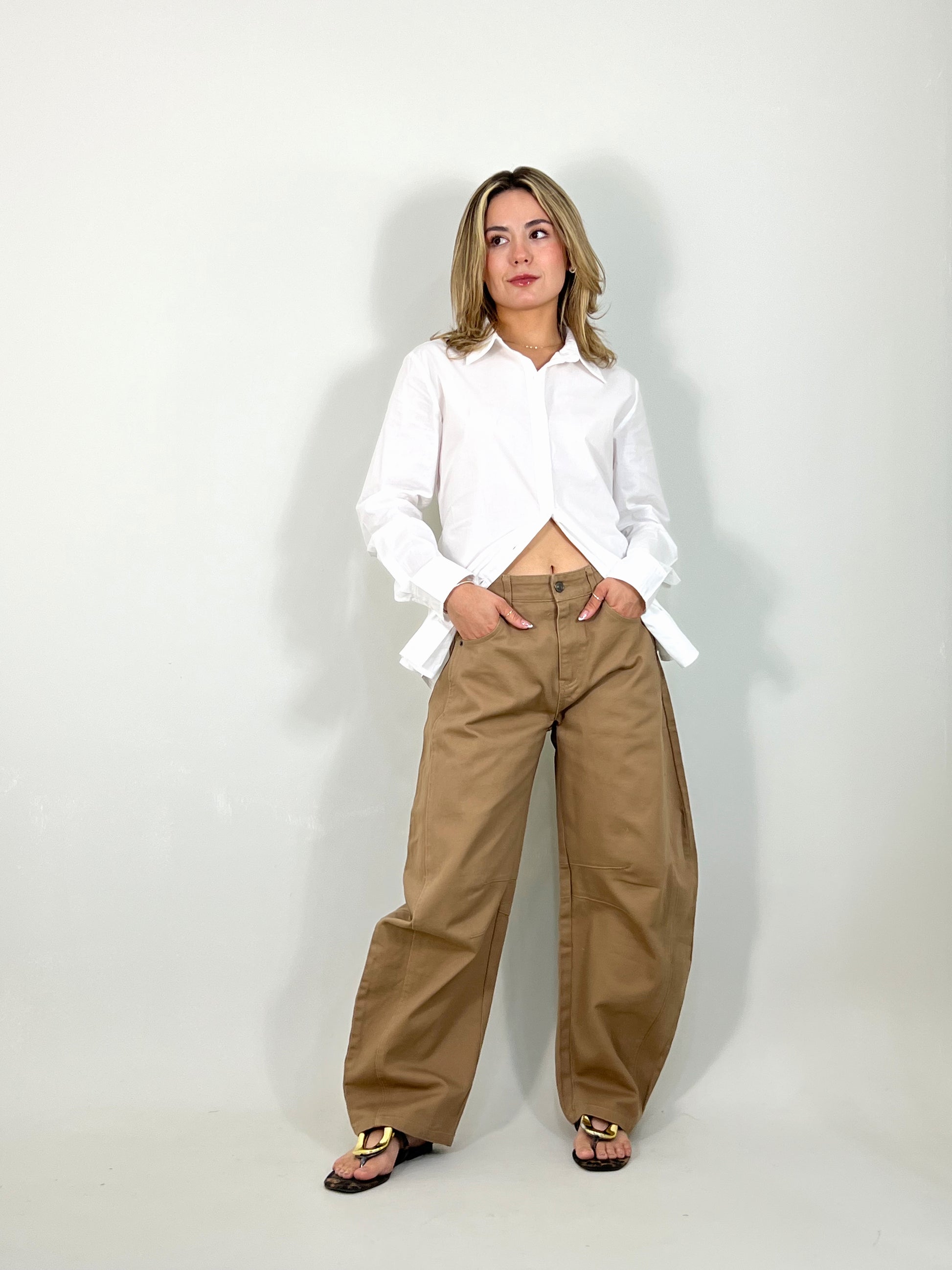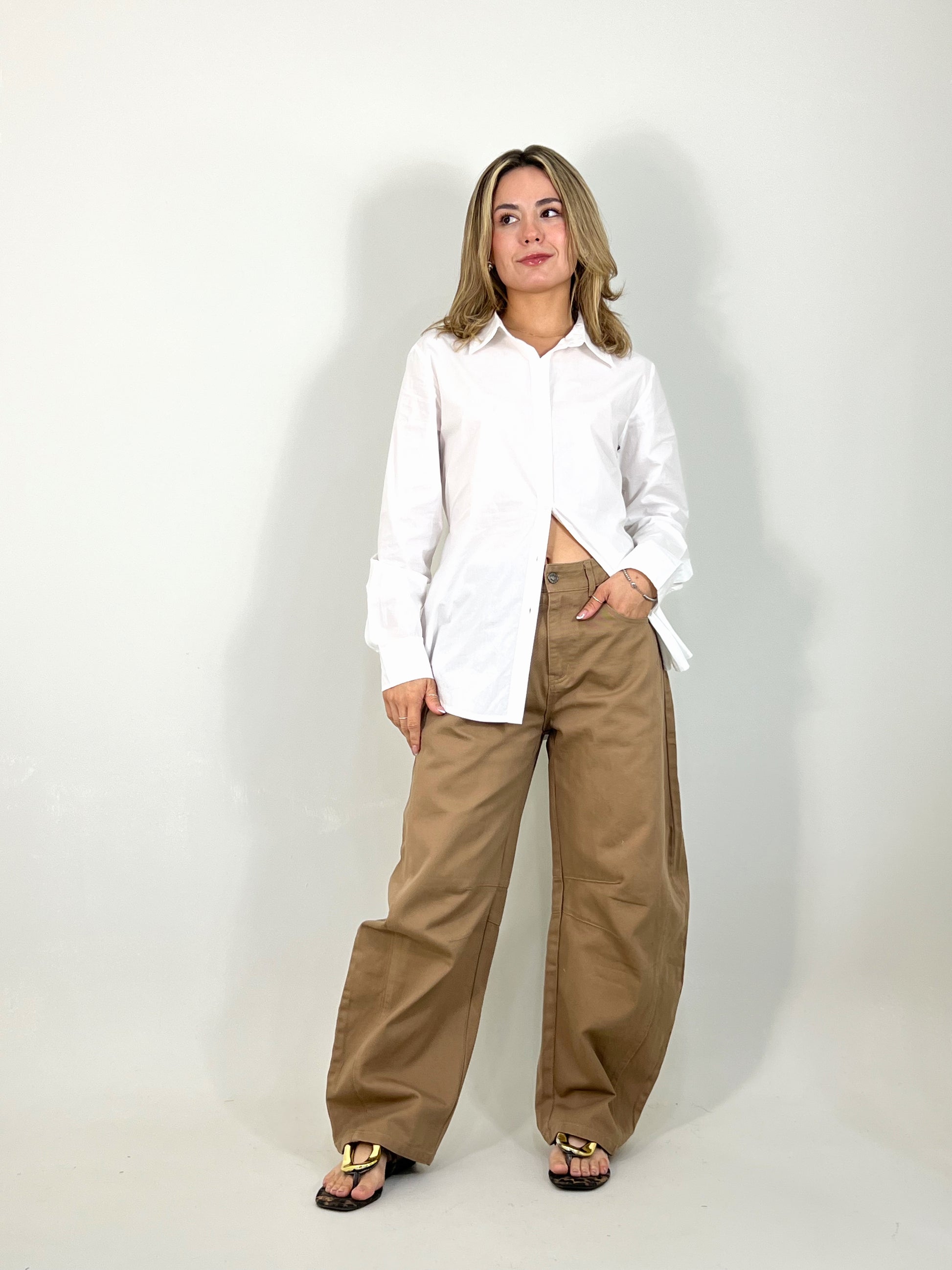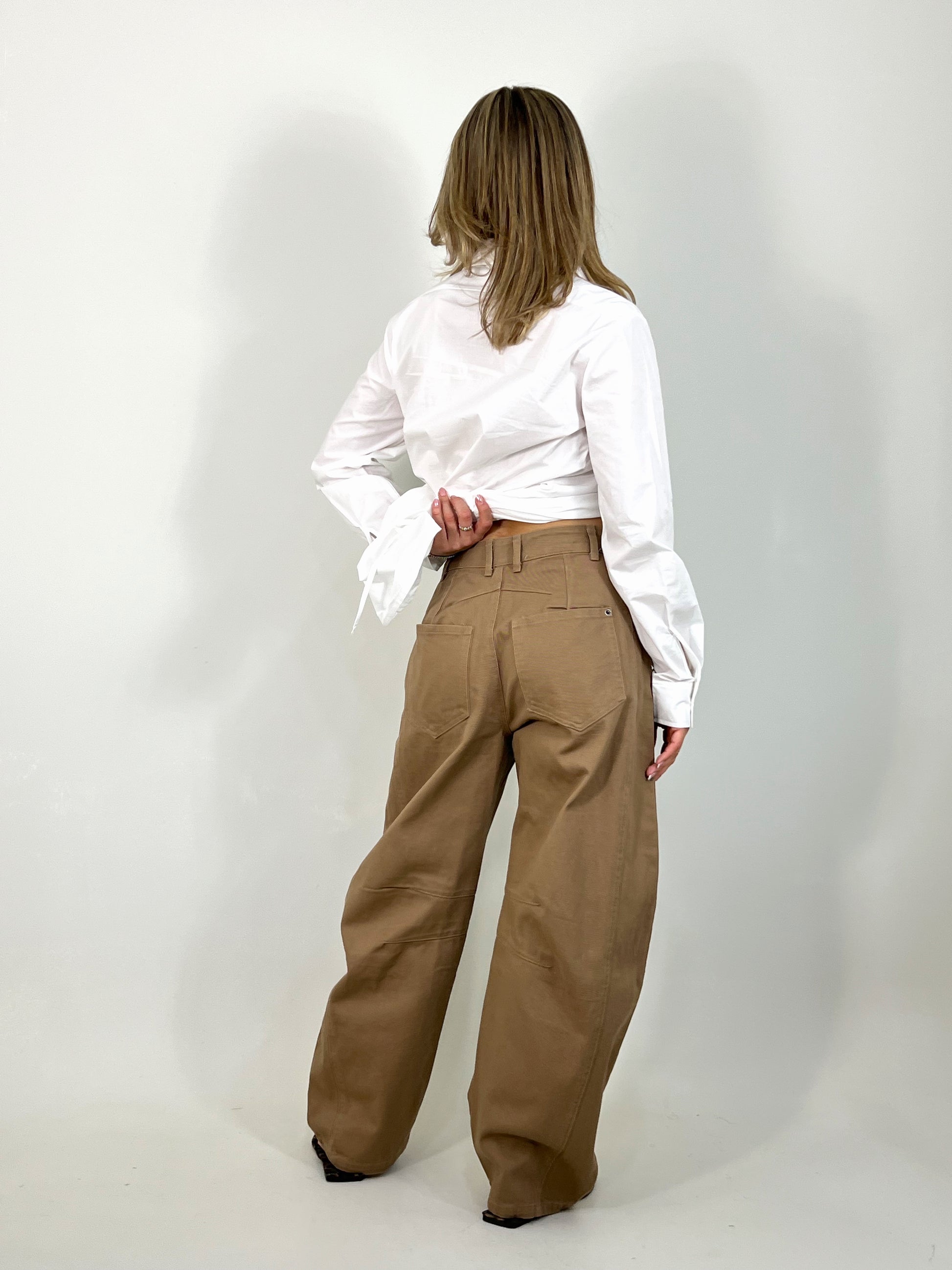 Pantalón corte ‘barrel’. Material mezclilla suave, corte ancho.