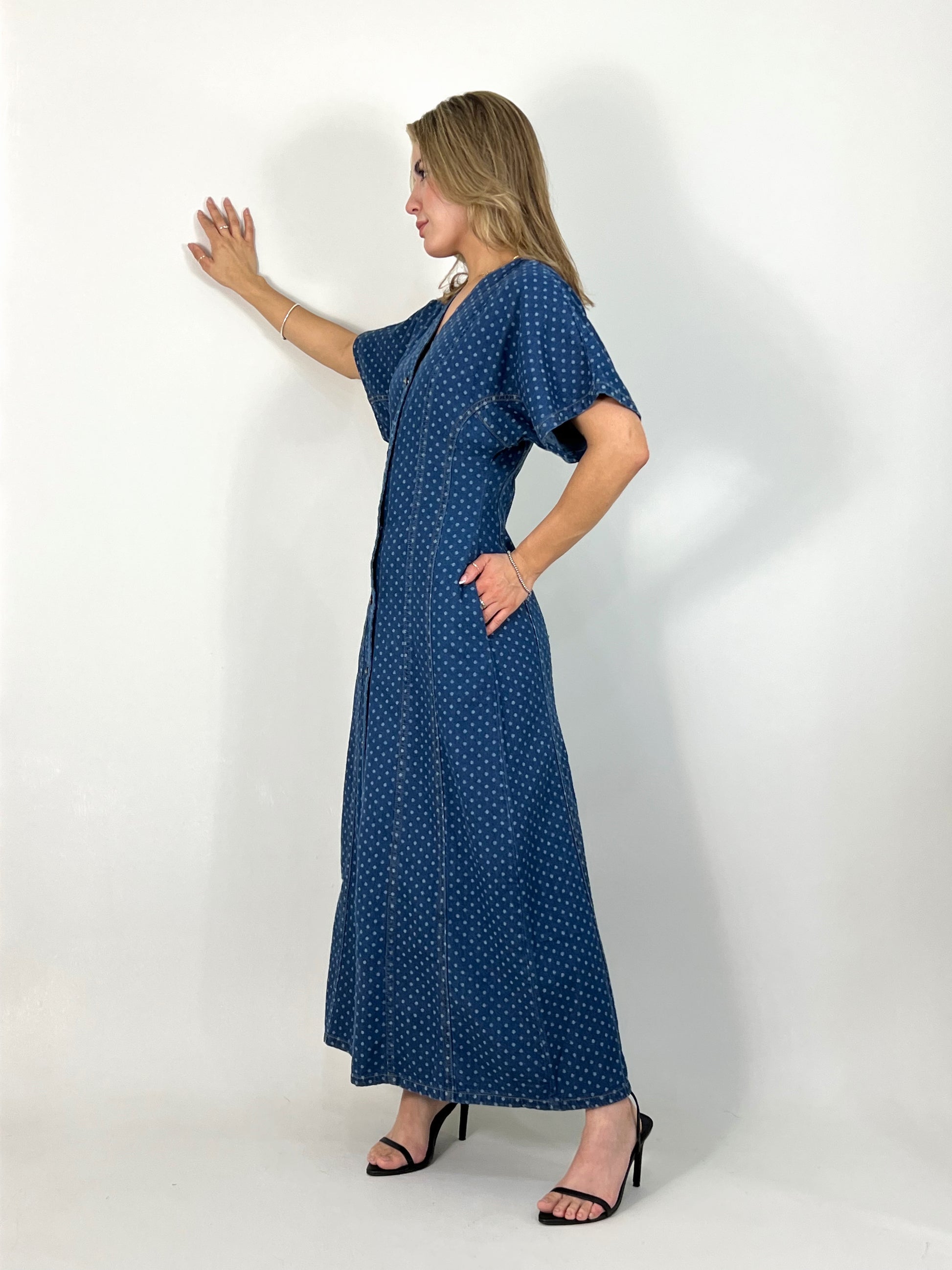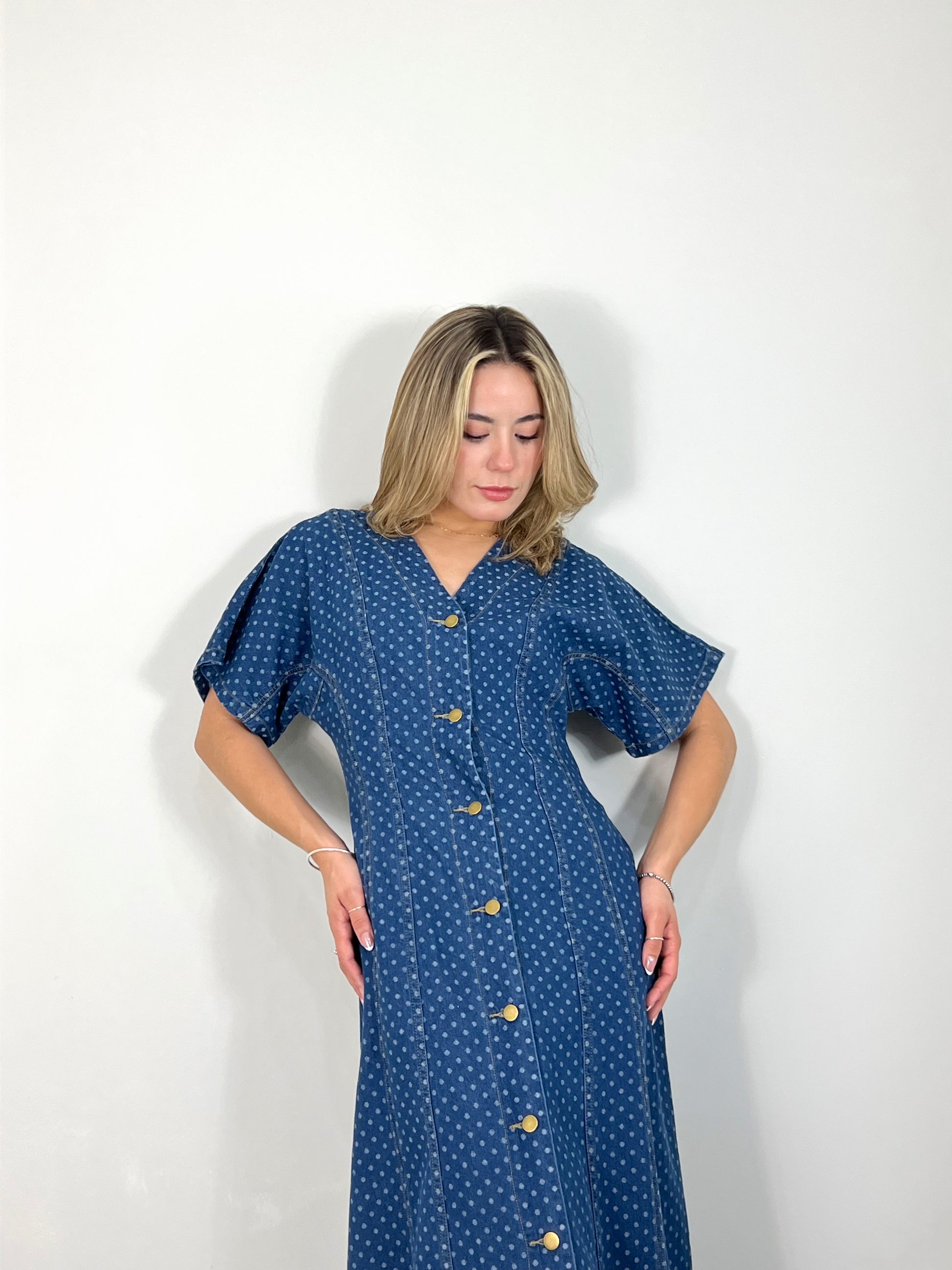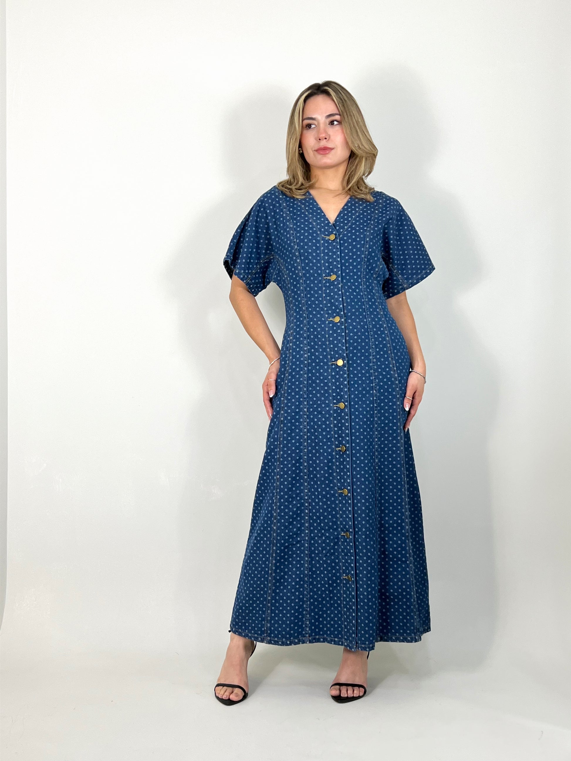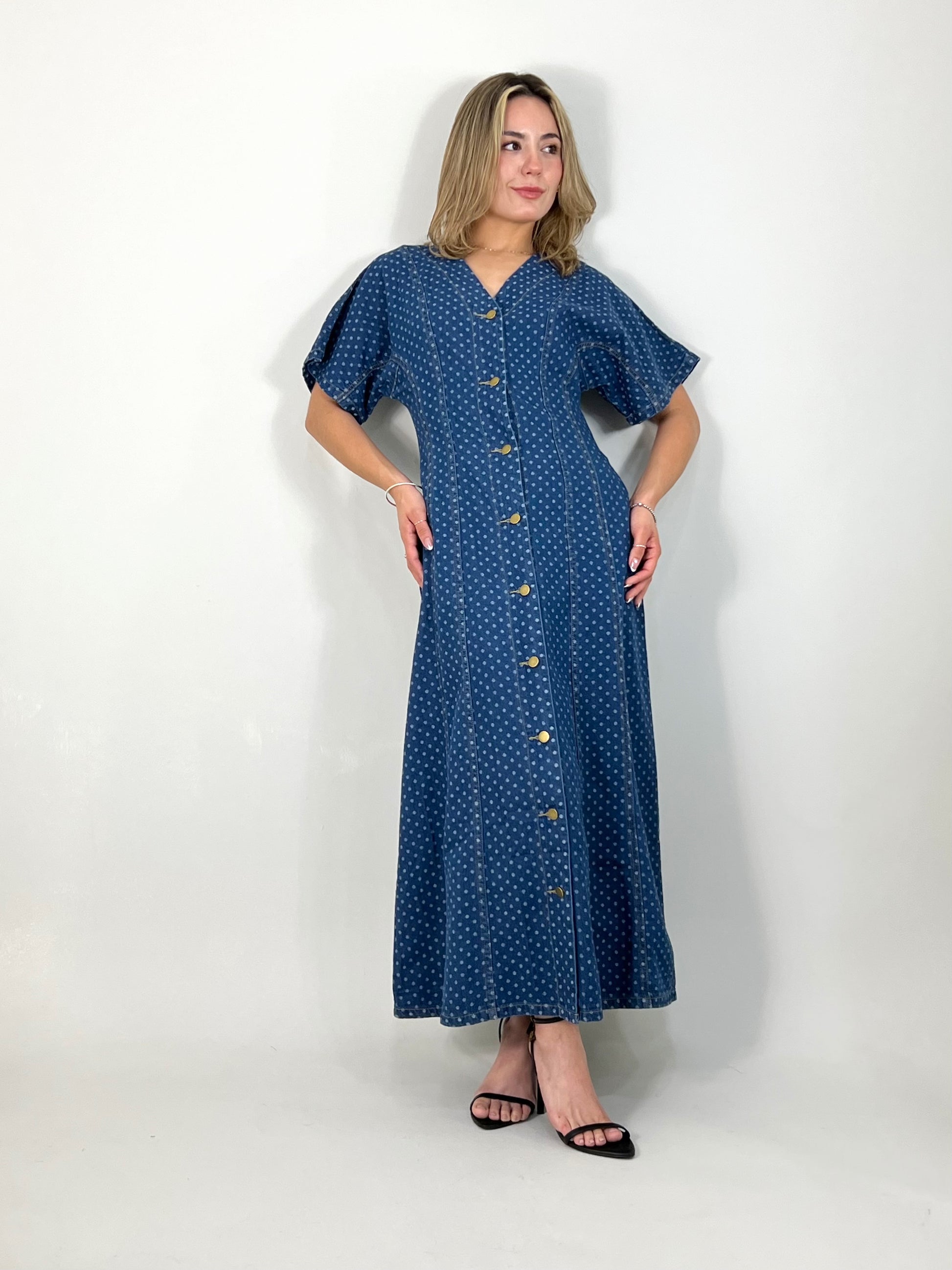 Vestido largo, material mezclilla suave, diseño de puntitos. Manga ancha, corte acinturado, amplio.