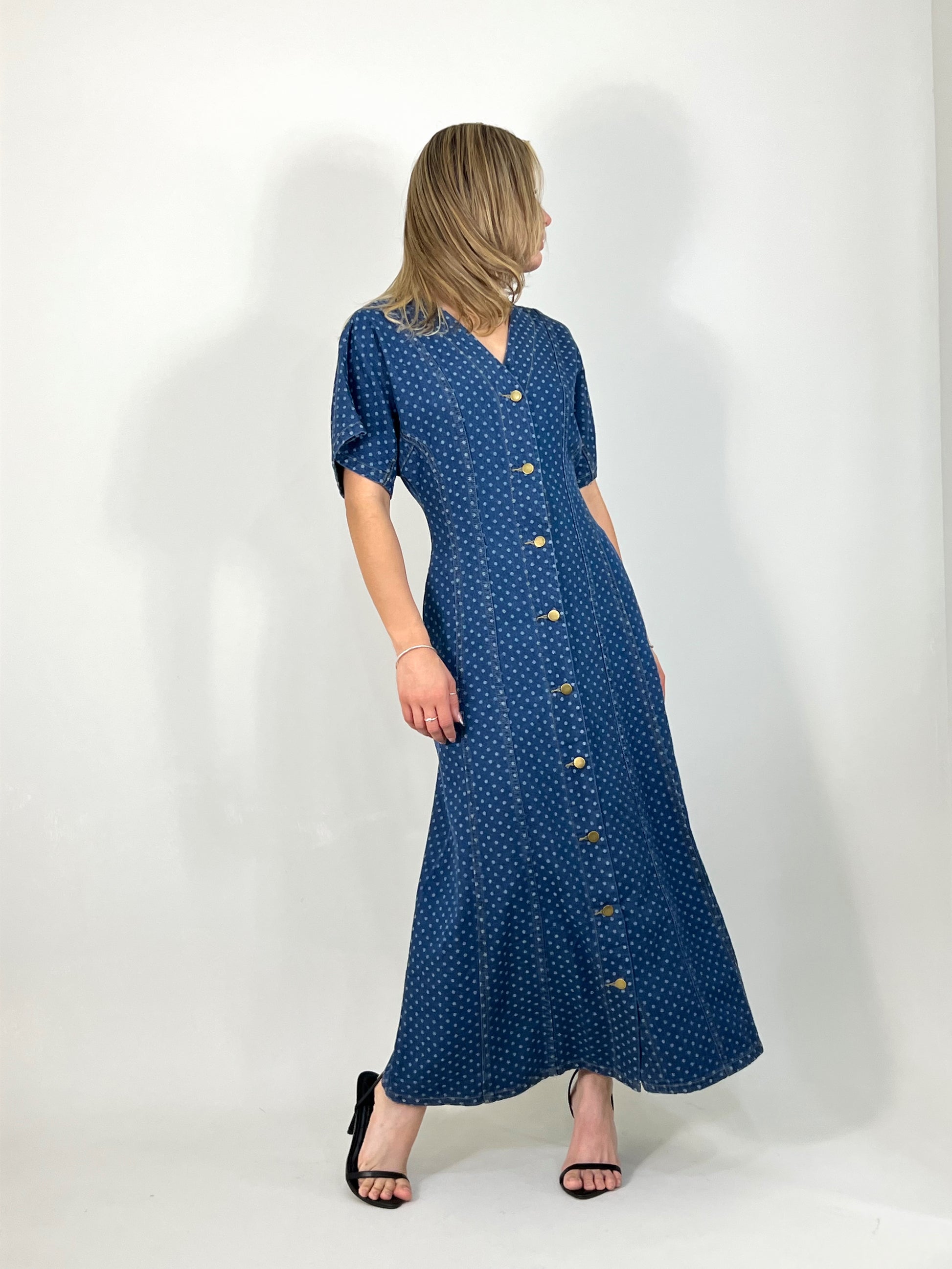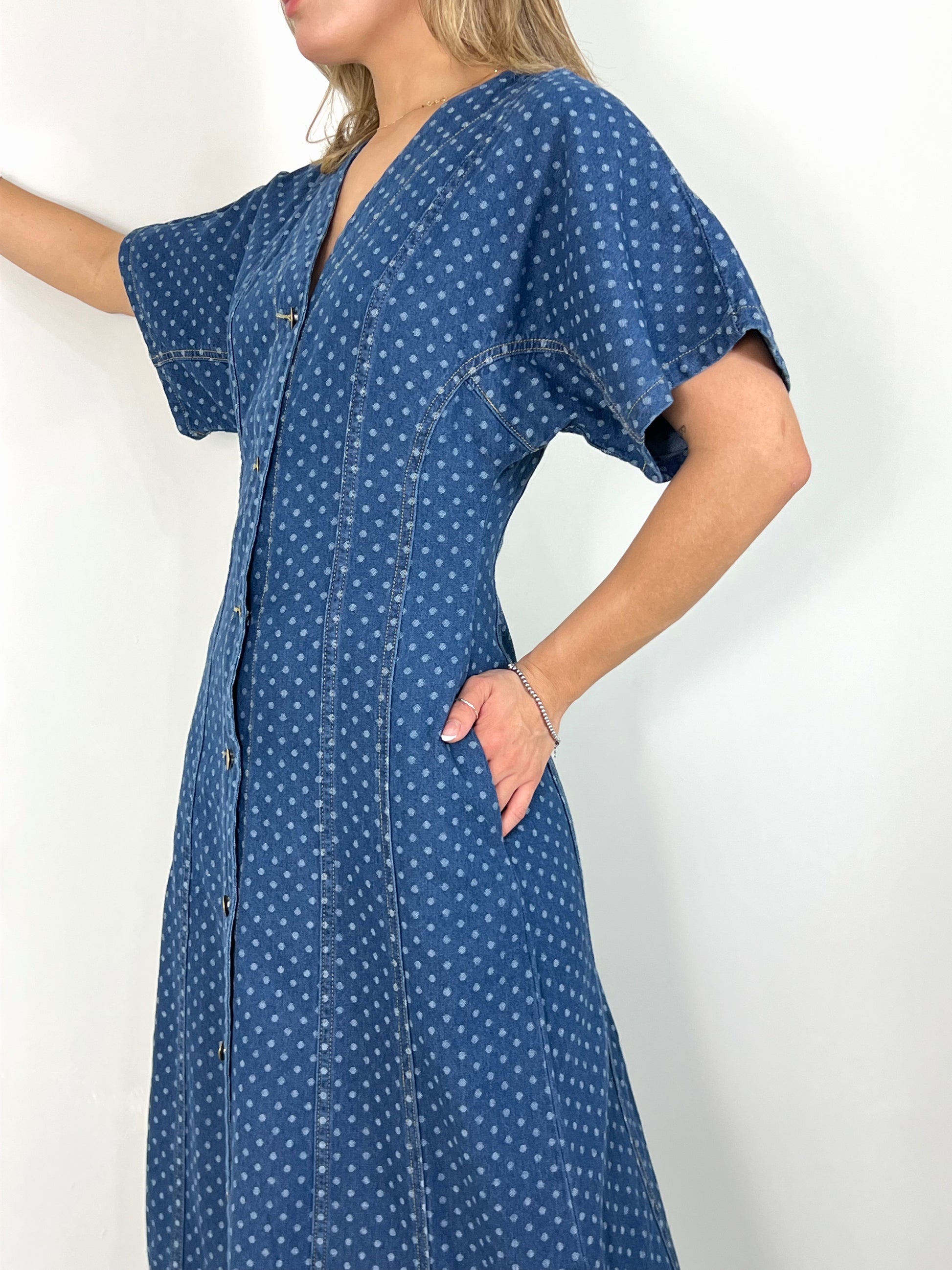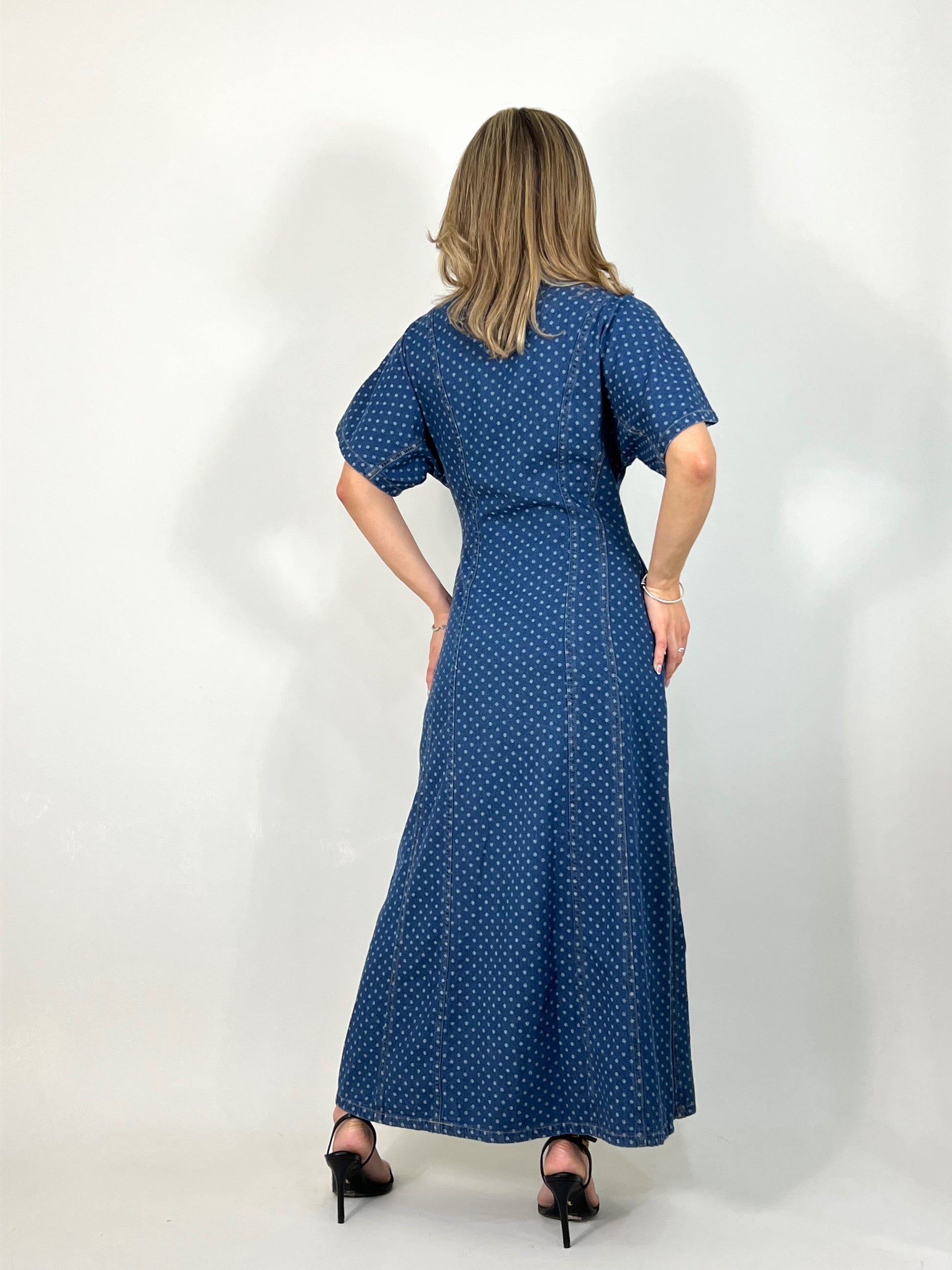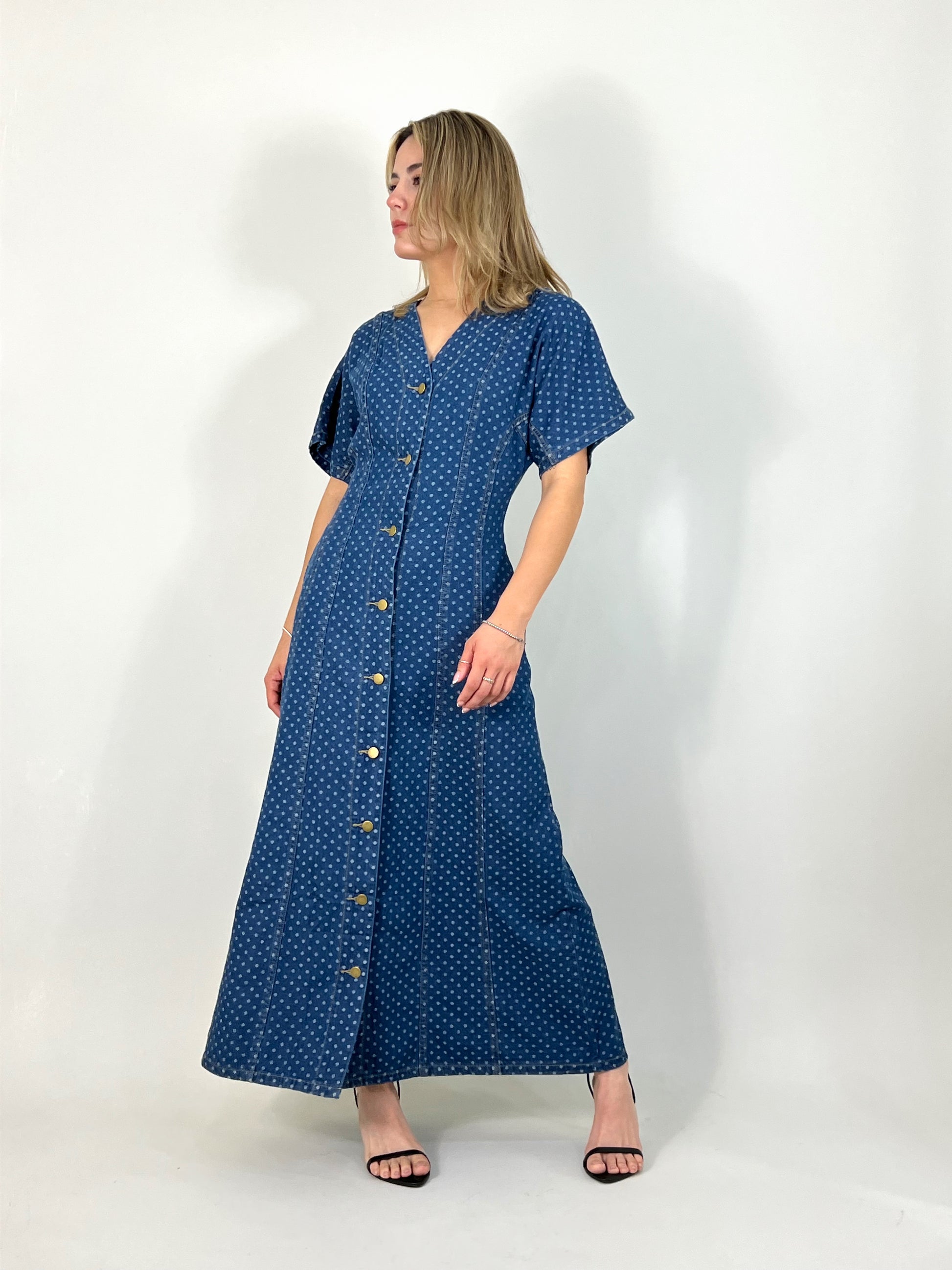 Vestido largo, material mezclilla suave, diseño de puntitos. Manga ancha, corte acinturado, amplio.